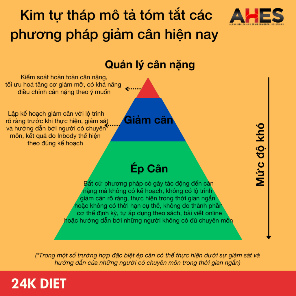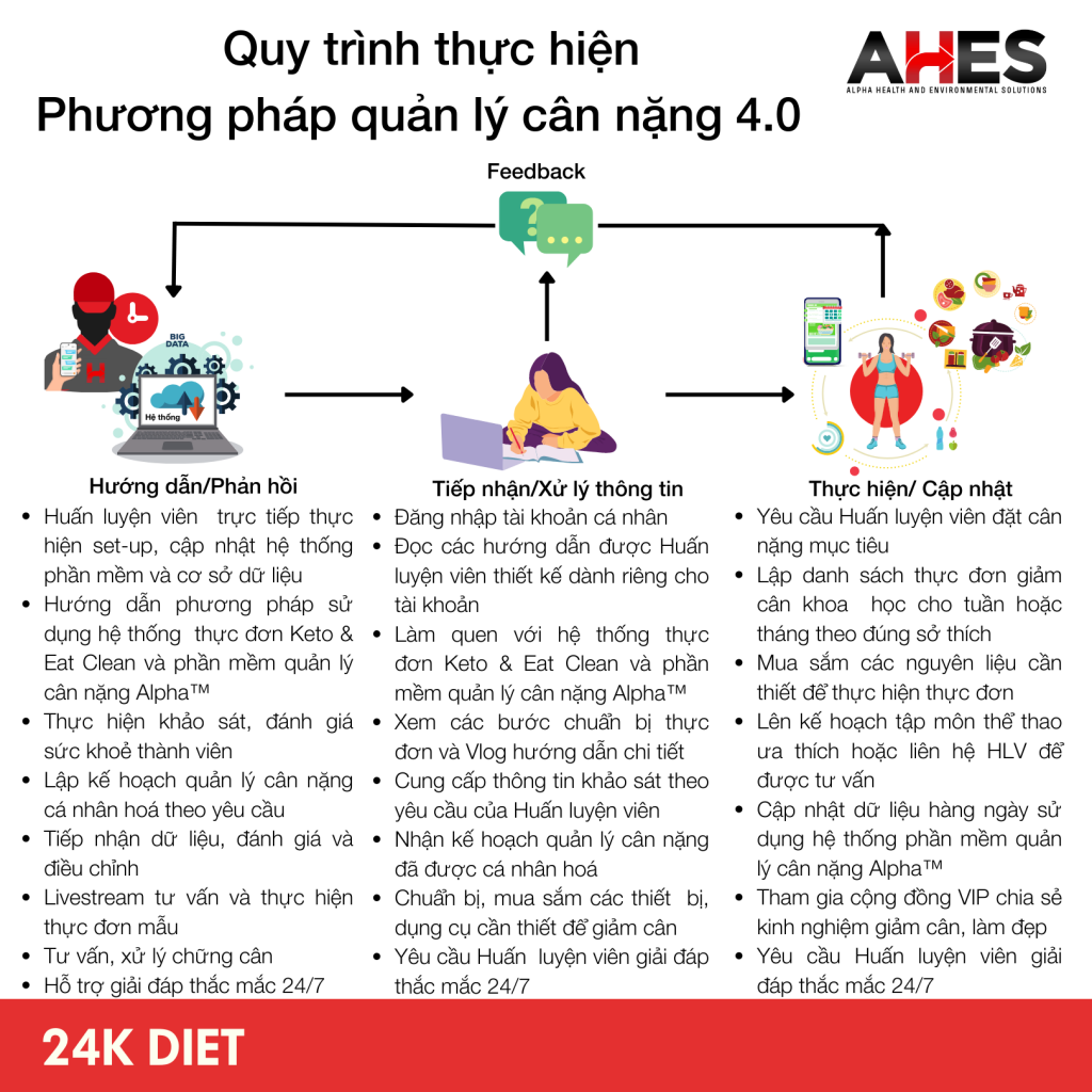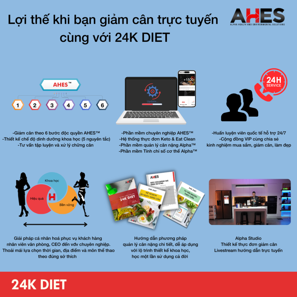 AHES ltd là đơn vị cung cấp giải pháp Quản lý cân nặng trực tuyến và toàn diện đầu tiên tại Việt Nam, với hệ thống 2000+ thực đơn Keto, Eat Clean lành mạnh được tích hợp cùng hệ thống phần mềm Tính chỉ số cơ thể Alpha™ và Quản lý cân nặng Alpha™ và Huấn luyện viên chuyên nghiệp có chứng chỉ quốc tế hướng dẫn trực tiếp sẽ đảm bảo giúp bạn có một trải nghiệm giảm cân hiệu quả, an toàn và khoa học nhất từ trước đến nay. Để tìm hiểu thêm về 24K DIET- Phương Pháp Quản Lý Cân Nặng 4.0 mời bạn xem thông tin dưới đây