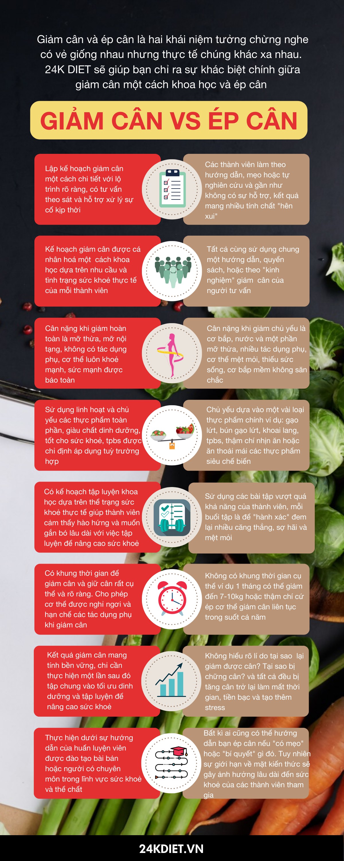 Giảm cân luôn là vấn đề được rất nhiều người quan tâm. Tuy nhiên, theo 24K DIET hiện nay có rất nhiều phương pháp giảm cân sai lầm không những không đem lại hiệu quả mà còn ảnh hưởng nghiêm trọng tới sức khỏe. Những phương pháp này thiên về giúp bạn ép cân hơn là giảm cân một cách khoa học. Ép cân có thể hiểu đơn giản là làm mọi cách có thể để giảm tổng trọng lượng của cơ thể bằng việc làm mất chủ yếu là nước, cơ bắp và một phần mỡ thừa. Ép cân có thể thực hiện được trong thời gian rất ngắn. Trong khi đó Giảm cân đề cập đến việc chỉ giảm duy nhất lượng mỡ thừa trên cơ thể của bạn một cách khoa học, giảm cân sẽ đòi hỏi nhiều thời gian hơn để cho cơ thể bạn có thể hồi phục sau một quá trình giảm mỡ và từ đó tránh được các tác dụng phụ làm ảnh hưởng lâu dài đến sức khoẻ cũng như bị tăng cân trở lại, đây là một mục tiêu có tính cụ thể và có lợi cho sức khỏe hơn rất nhiều so với ép cân.