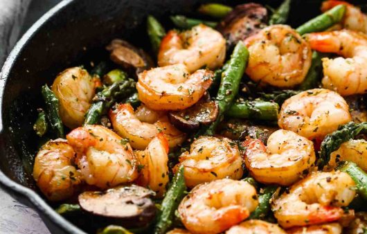 Tôm xào nấm thịt heo xông khói