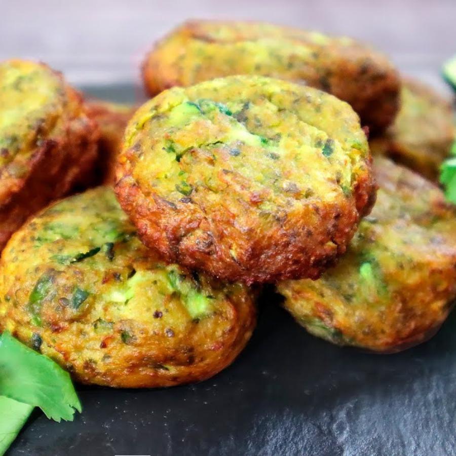 Dùng một cái bát, trộn bột hạnh nhân với cùi dừa, bí ngòi và các thành phần nguyên liệu khác, trộn đều thành một khối bột, nặn hình 8 chiếc bánh và xếp lên khay nướng có lót sẵn giấy nến