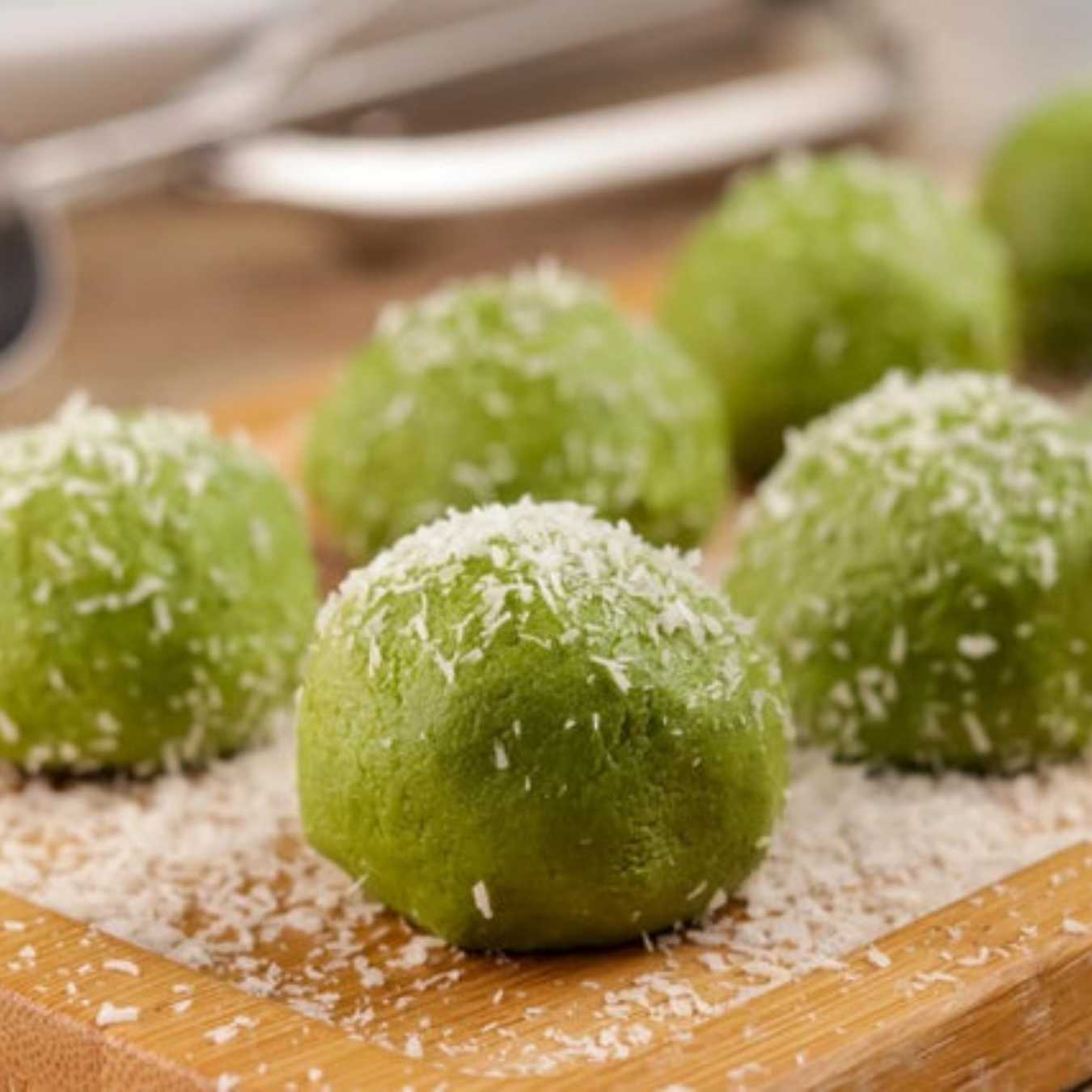 Lăn nhanh các quả bóng giữa hai lòng bàn tay để nặn thành hình những quả bóng bàn, sau đó lăn từng quả bóng qua hỗn hợp dừa/matcha cho đến khi được phủ đều