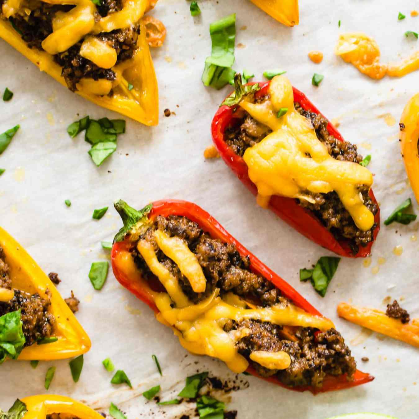 Cho ớt lên khay nướng đã lót sẵn giấy bạc, nhồi hỗn hợp thịt bò và rắc phô mai lên, cho vào lò nướng ở nhiệt độ 200ºC (400ºF) và nướng trong 10 phút