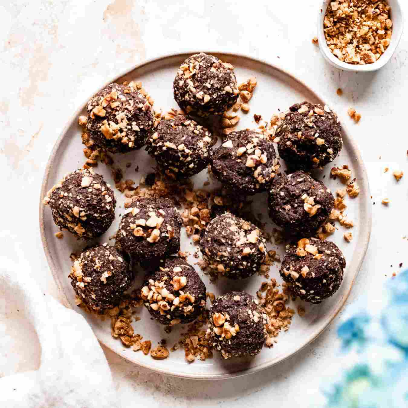 Cho hạt phỉ đã xay trong một cái bát. Lăn hỗn hợp kem phô mai thành 16 viên. Lăn từng viên qua hạt phỉ xay