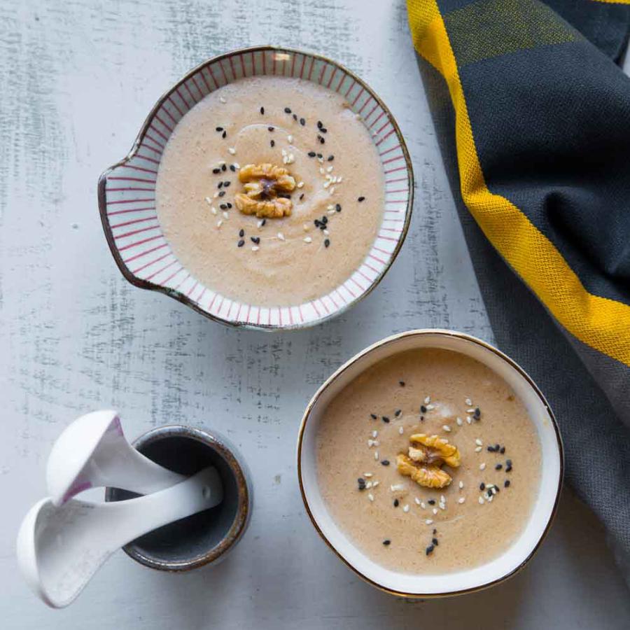 Dùng một chiếc chảo, cho cơm súp lơ với đường Stevia, nước cốt dừa và các thành phần nguyên liệu khác vào, đánh đều, đun nhỏ lửa và nấu trên lửa mức vừa nhỏ trong 30 phút. Chia bánh ra bát và thưởng thức