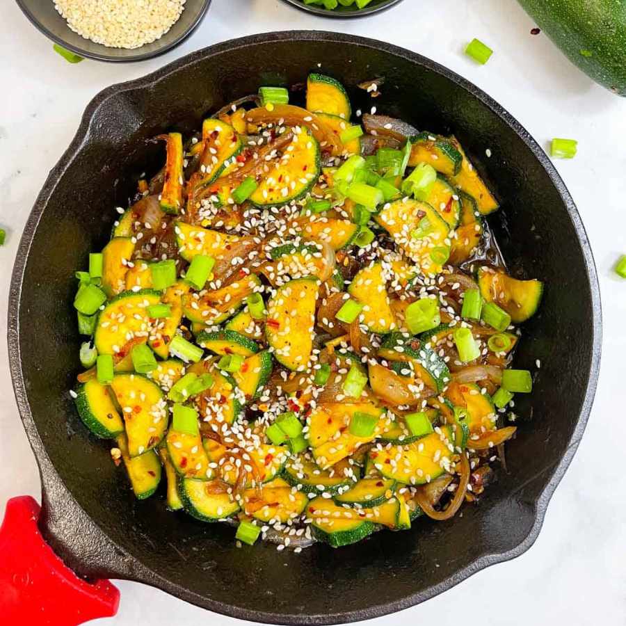 Làm nóng chảo với dầu ăn ở lửa vừa, cho bí ngòi, dưa chuột và các thành phần nguyên liệu khác vào, đảo đều, áp chảo trong 10 phút, chia ra các đĩa và thưởng thức