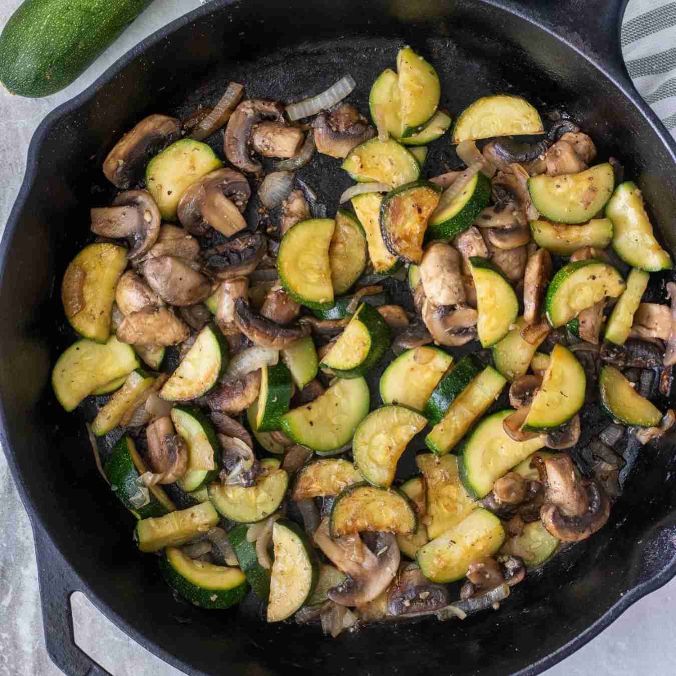 Thêm nấm, bí ngòi, đảo đều và nấu trong 5 phút. Thêm tỏi, cà chua, gia vị Ý, đảo đều, xào trong 6 phút
