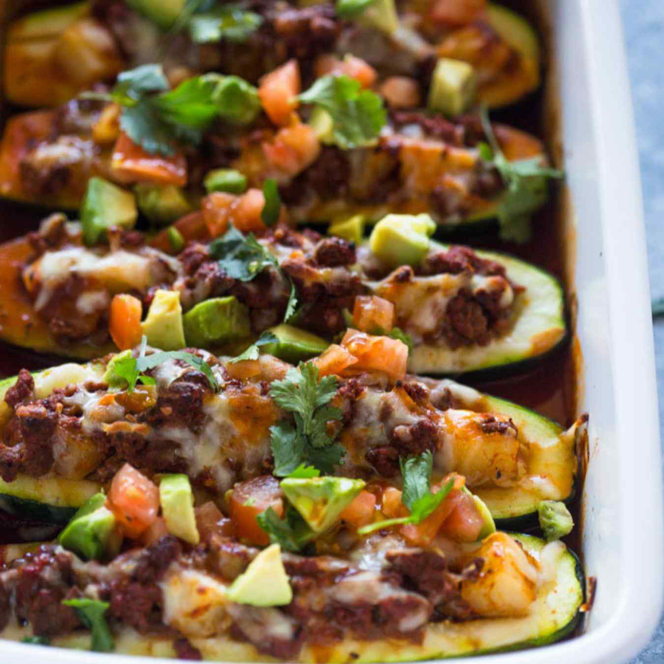 Dùng một chiếc khay nướng, đặt hai nửa bí ngòi vào khay, nhồi thịt bò vào và rưới đều nước sốt Enchilada , sau đó rắc phô mai Cheddar lên