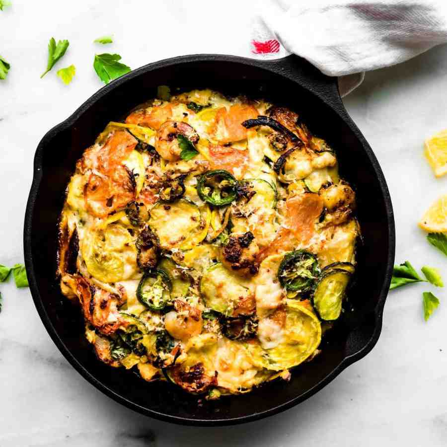 Dùng một chiếc khay nướng, trộn kết hợp bí ngòi với hành tây và các nguyên liệu khác, trộn đều rồi nướng ở nhiệt độ 200°C trong 30 phút, chia ra đĩa và thưởng thức
