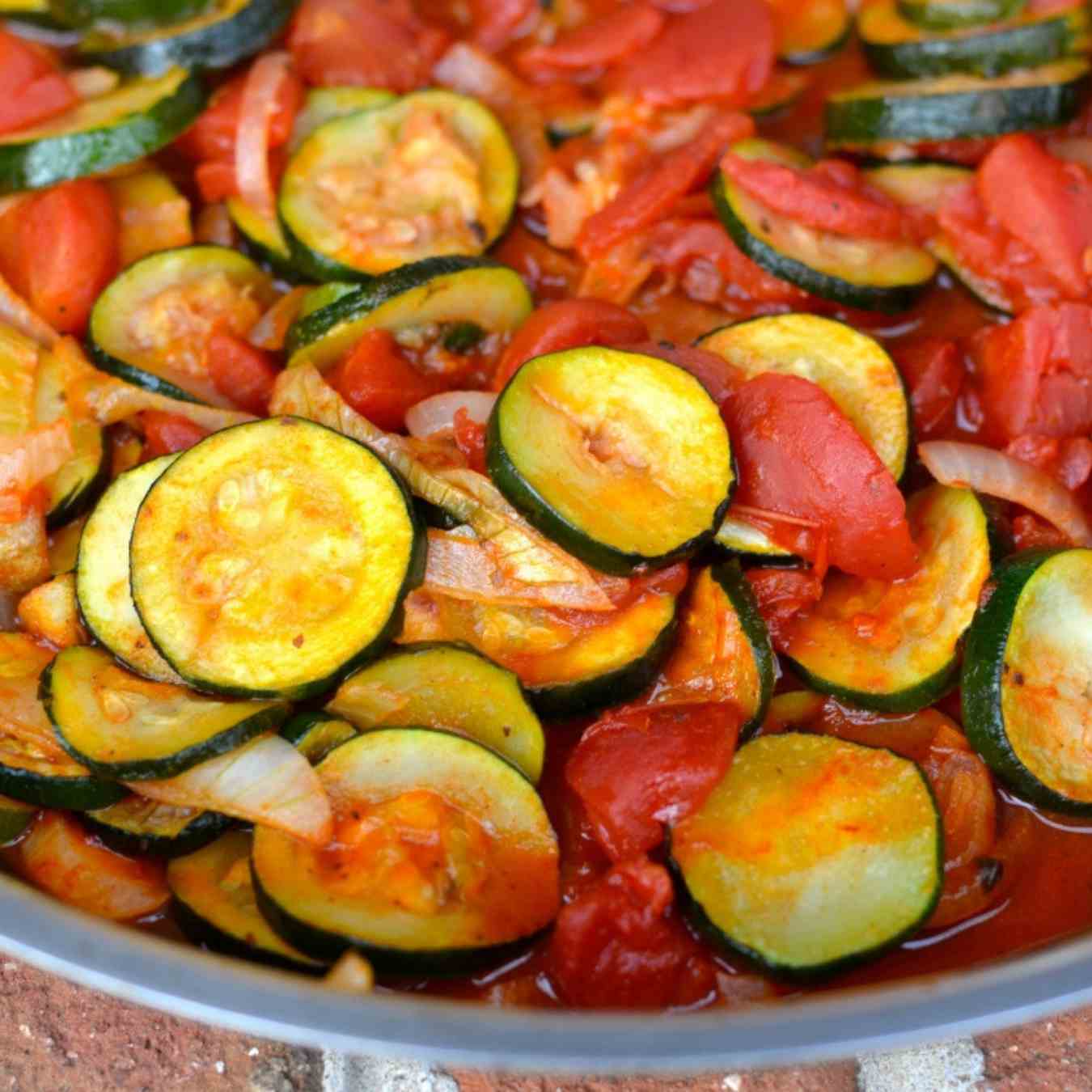 Thêm bí ngòi và cà chua vào, đảo đều và nấu trong 5 phút