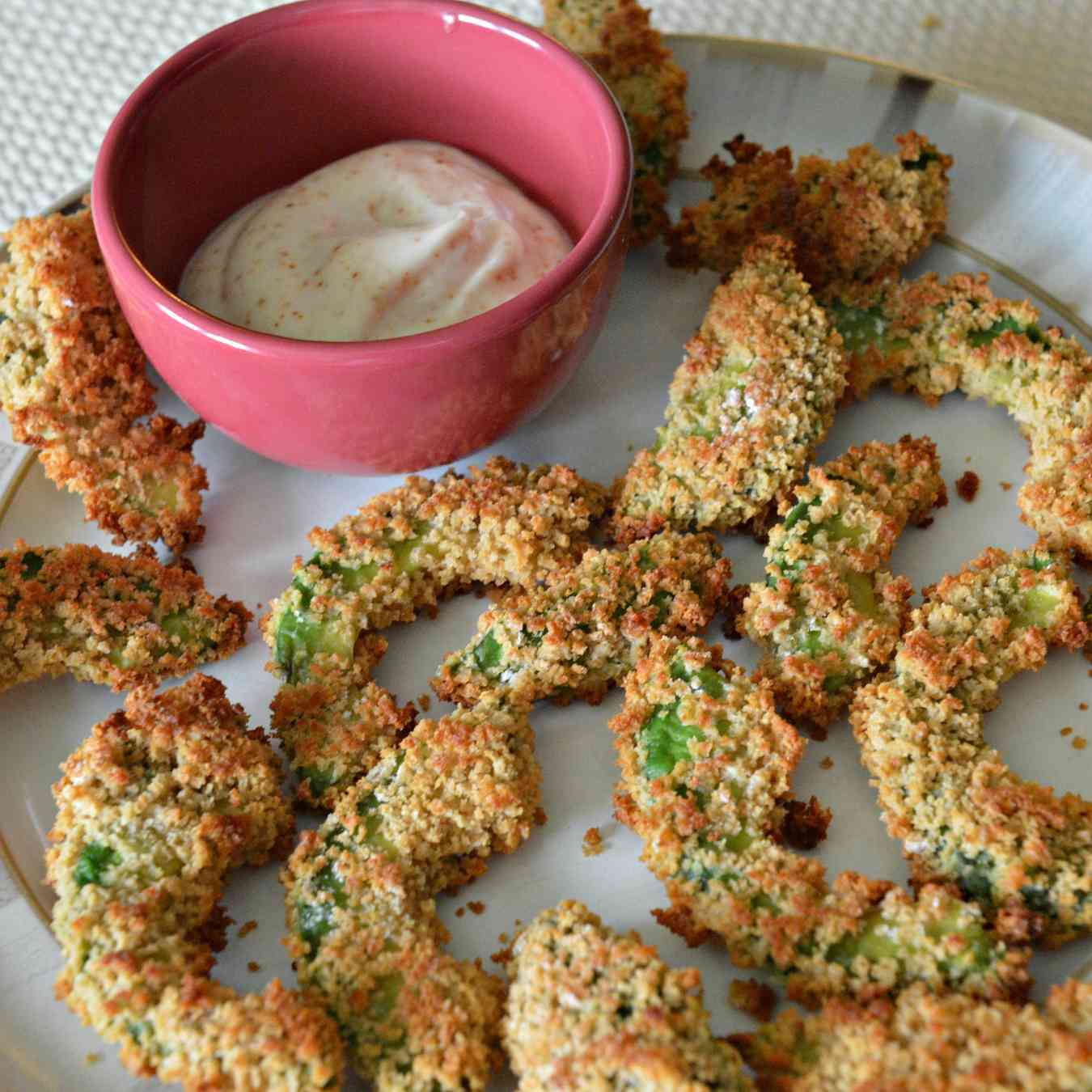 Nhúng các lát bơ vào hỗn hợp trứng, sau đó lăn qua bì lợn vụn, sau đó lặp lại, tạo thành các lớp đều ở hai mặt