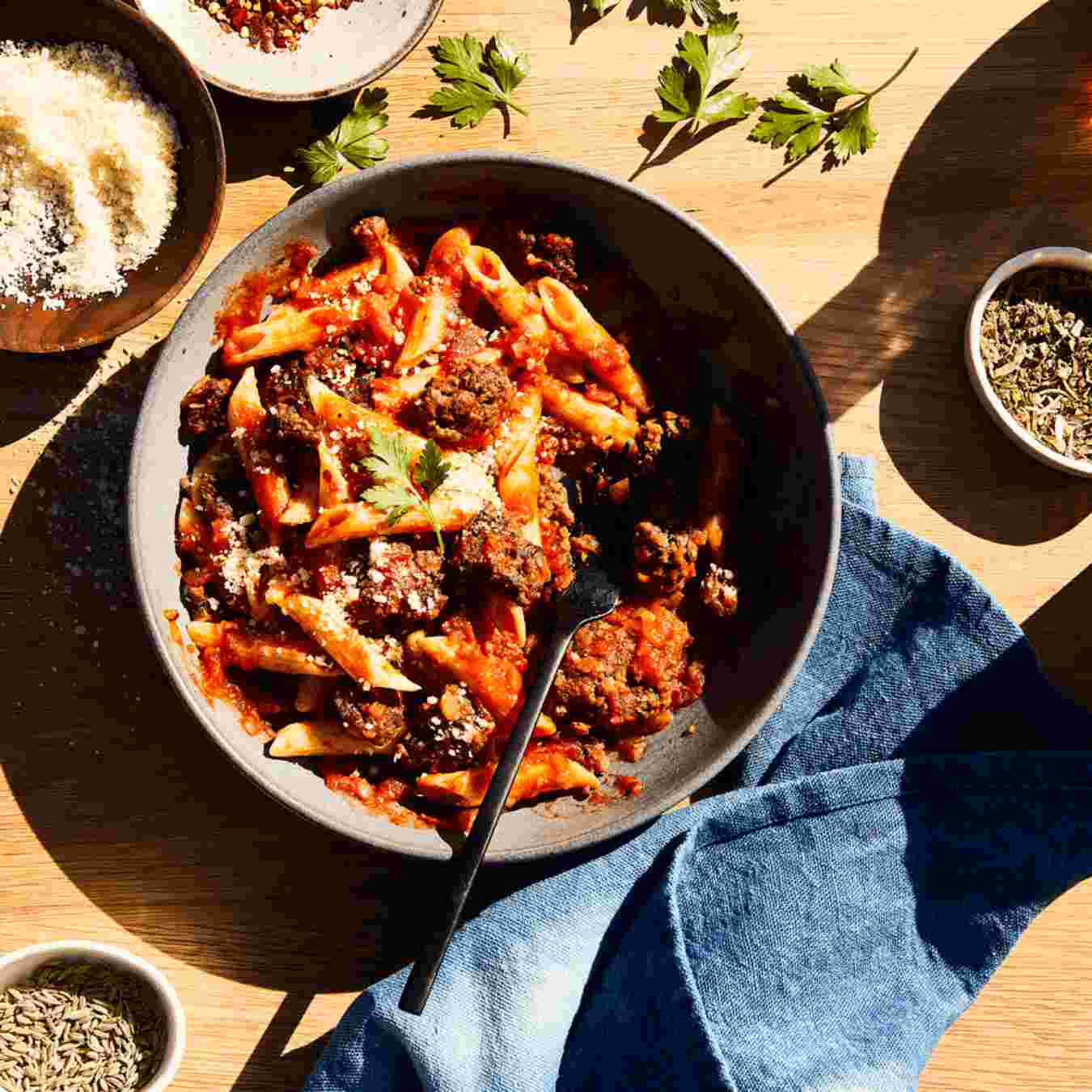 Thưởng thức mì phủ với sốt ragu, rưới thêm dầu ôliu (bạn có thể trang trí với húng quế tươi và rắc phô mai Parmesan bào lên trên)