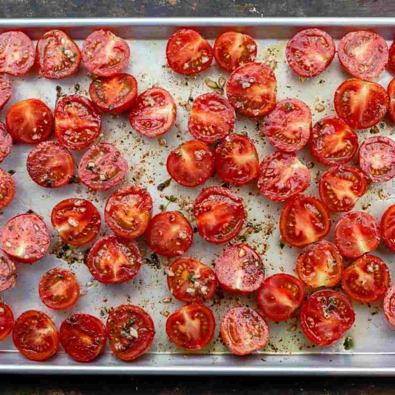 Dùng một cái khay nướng, cho cà chua với ớt bột và các thành phần nguyên liệu khác vào, trộn đều và nướng ở nhiệt độ 185°C (370°F) trong 30 phút.