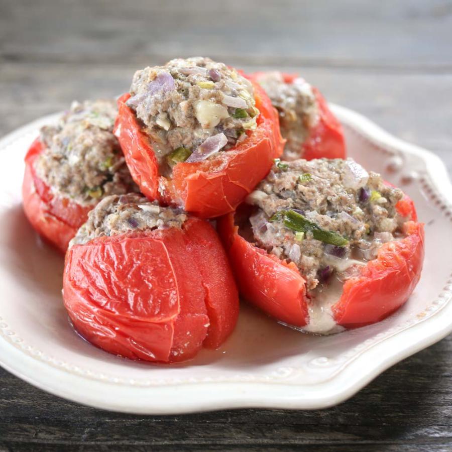 Nhồi thịt vào cà chua. Bày lên đĩa và đem hấp cho đến khi chín. Cà chua màu đỏ sẫm có mùi thơm hạt tiêu, ăn có vị vừa, hơi chua ngọt