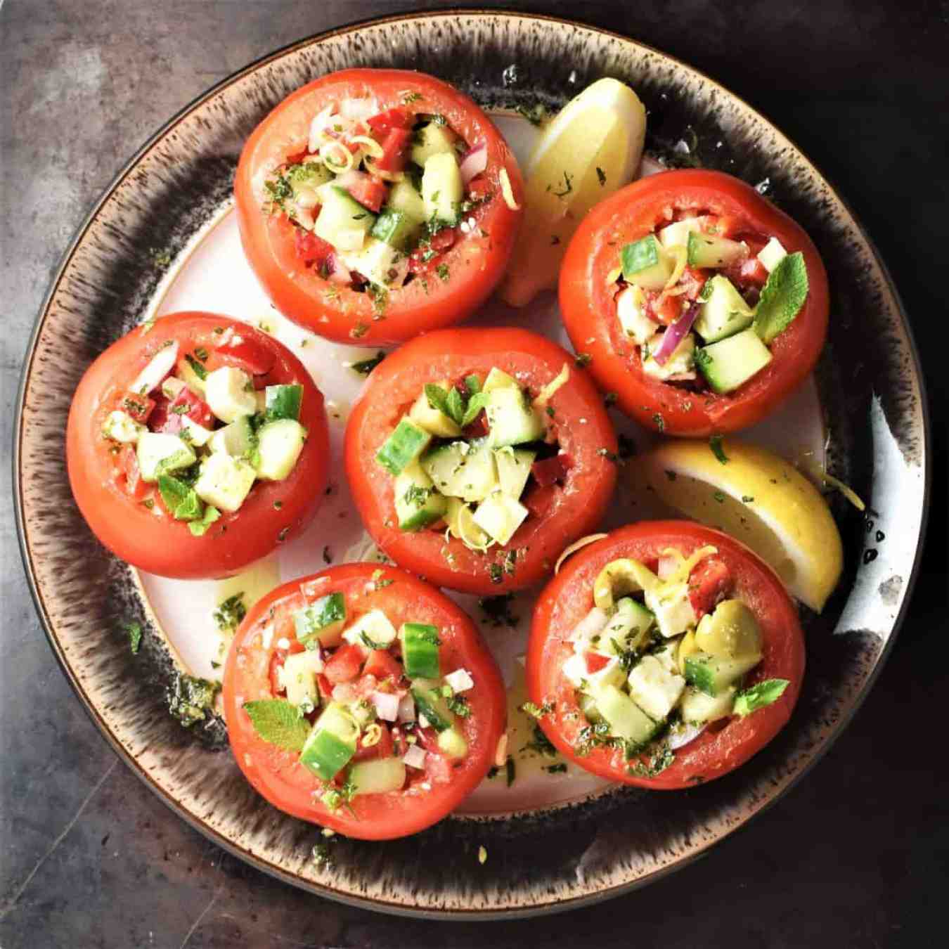 Chia lá hẹ và các nguyên liệu khác vào từng quả cà chua, cho chảo vào trong lò và nướng ở nhiệt độ 190°C (375°F) trong 20 phút