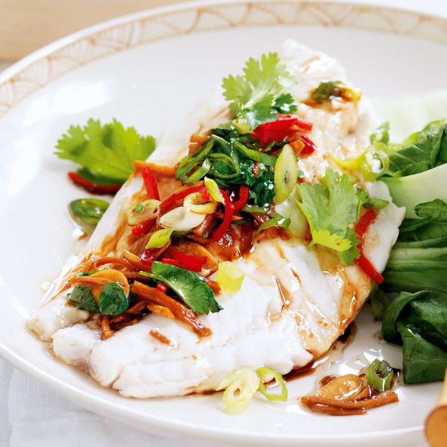 Phi thơm hành tỏi cho mực, bóng, củ cải, nấm, mộc nhĩ, miến Shirataki, đảo nhanh, cho tiếp mắm, muối, mì chính, đường ăn kiêng, hạt tiêu, nước dừa, trộn đều rưới trùm lên cá rồi đem hấp 5 phút. Rắc lạc rang giã dập, rau mùi, hạt tiêu rồi ăn nóng