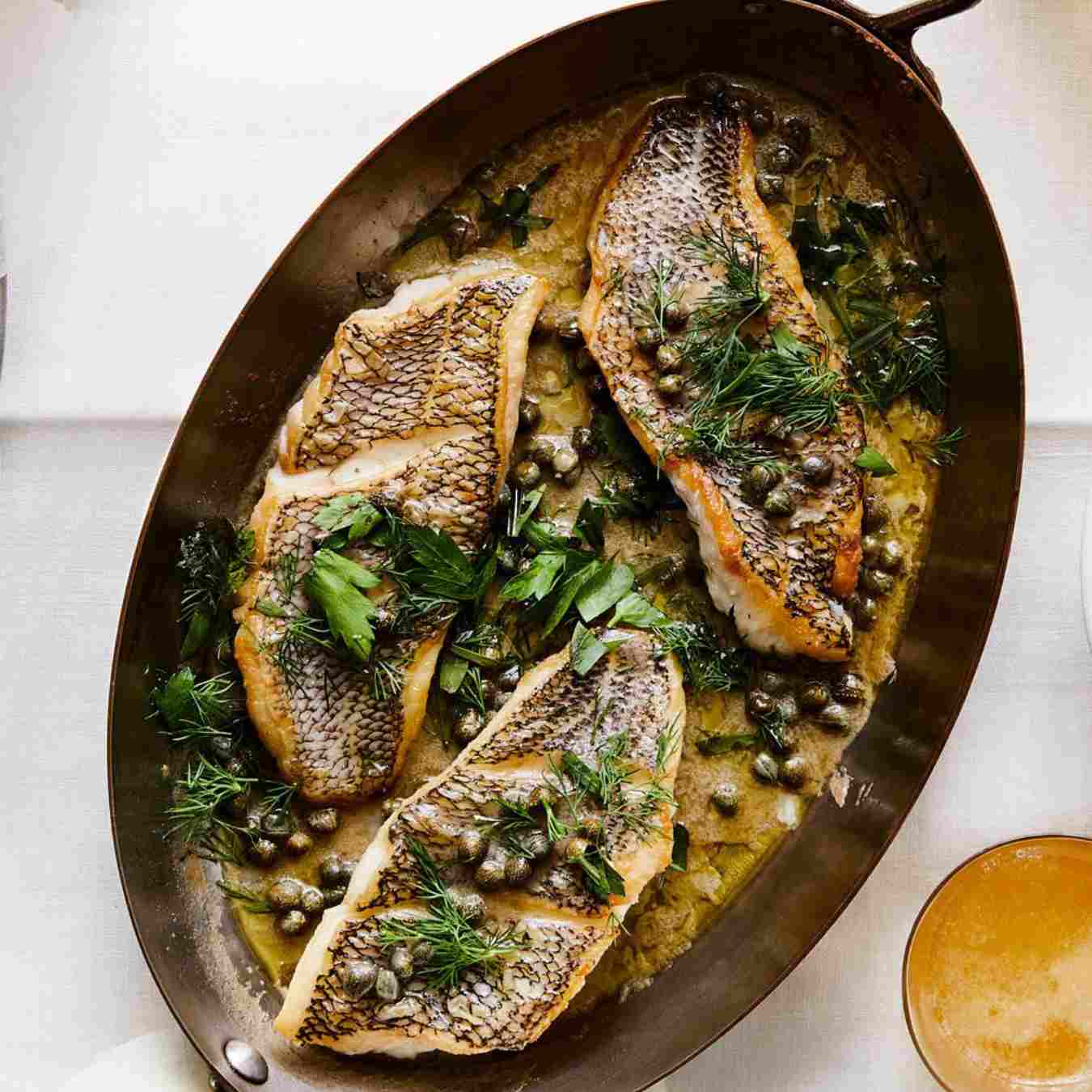 Cho phi lê cá vược vào khay nướng, nêm muối, tiêu, thêm nụ bạch hoa, thì là và lát chanh lên trên