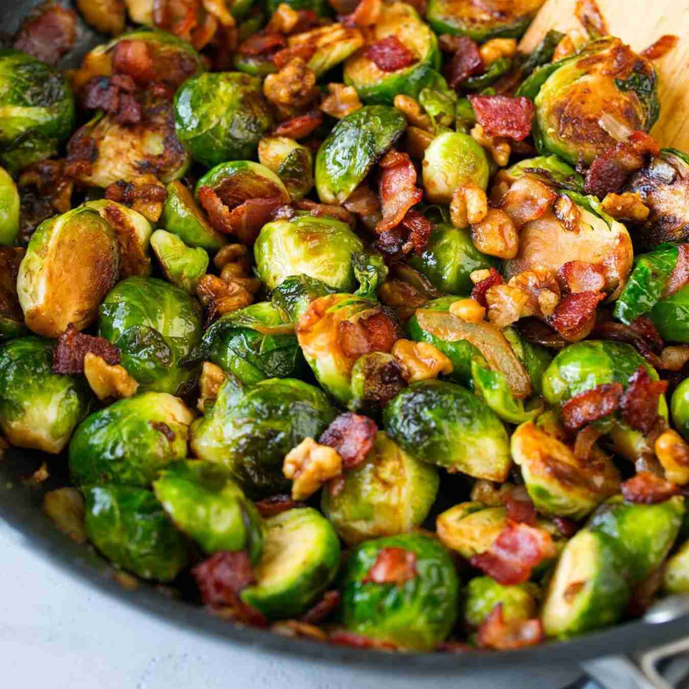 Làm nóng chảo trở lại trên lửa vừa, cho hành tím và tỏi vào, đảo đều và nấu trong khoảng 30 giây. Thêm cải Brussels, muối, tiêu, giấm táo, đảo đều và nấu trong 5 phút