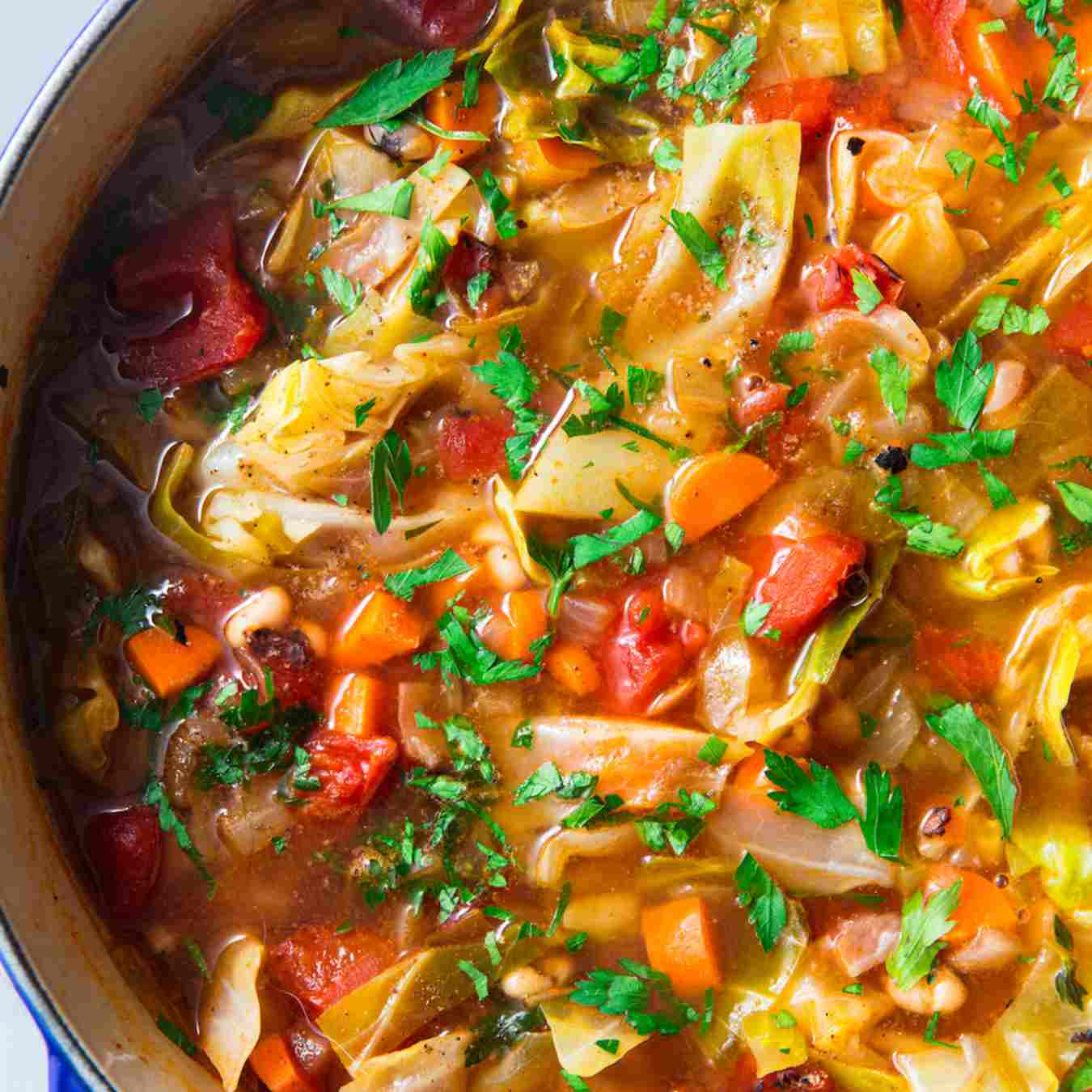 Cho bắp cải và các nguyên liệu khác vào, đảo đều, đun nhỏ lửa và nấu trên lửa vừa trong 25 phút nữa