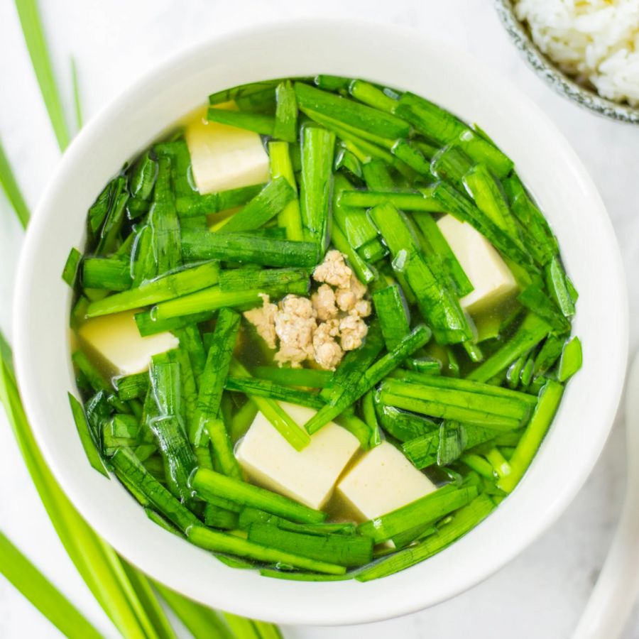 Đun sôi nước, nêm vừa mắm muối, thả đậu phụ đun sôi cho tiếp thịt, tim, nêm vừa gia vị cho hẹ sôi trở lại. Nấu cho đến khi có mùi thơm đặc trưng của hẹ, thịt và tim chín tới không dai. Bắc ra và ăn nóng