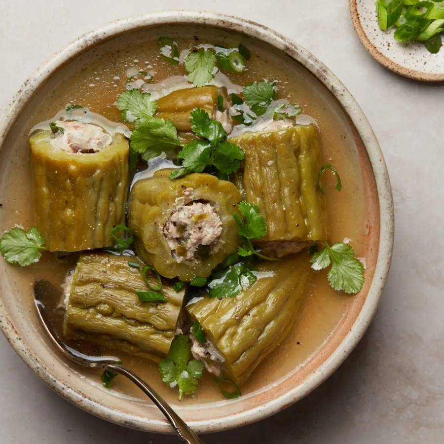 Thịt băm nhỏ cùng với hành củ, bóp kỹ với hạt tiêu, nước mắm, mì chính, rồi nhồi thật chặt vào mướp đắng đã ráo nước, cuối cùng lấy tay nhúng nước lạnh ép lên mặt thịt cho thật phẳng