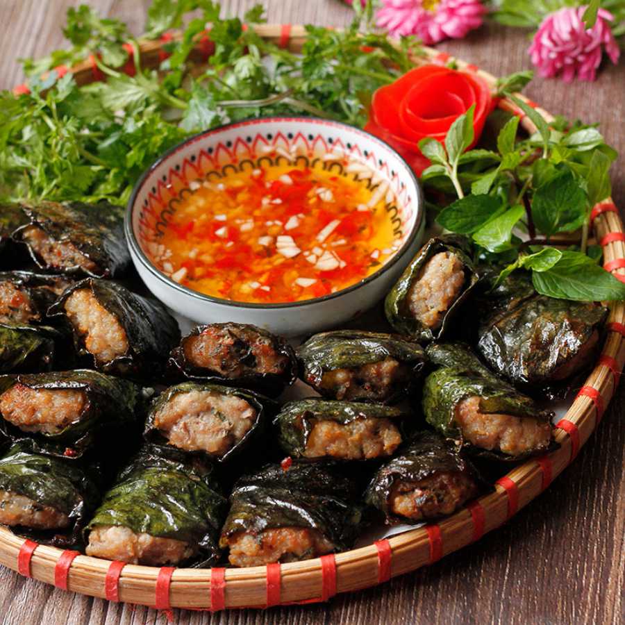 Lá xương sông rửa sạch để nguyên lá cho thịt băm vào giữa cuộn tròn lại (mỗi viên 20-25g thịt) lấy cuống lá cài lại như têm trầu