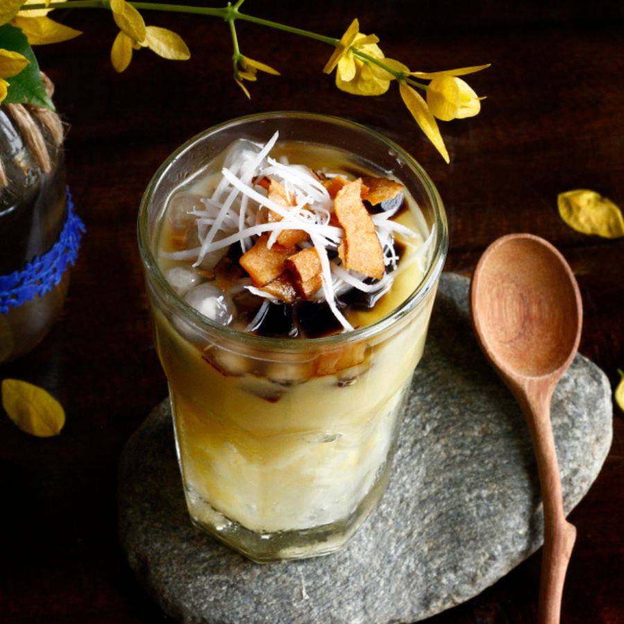 Chè màu vàng rơm, thơm mùi vani, vị ngọt mát. Chè có trạng thái đồng nhất. Chúc bạn ngon miệng