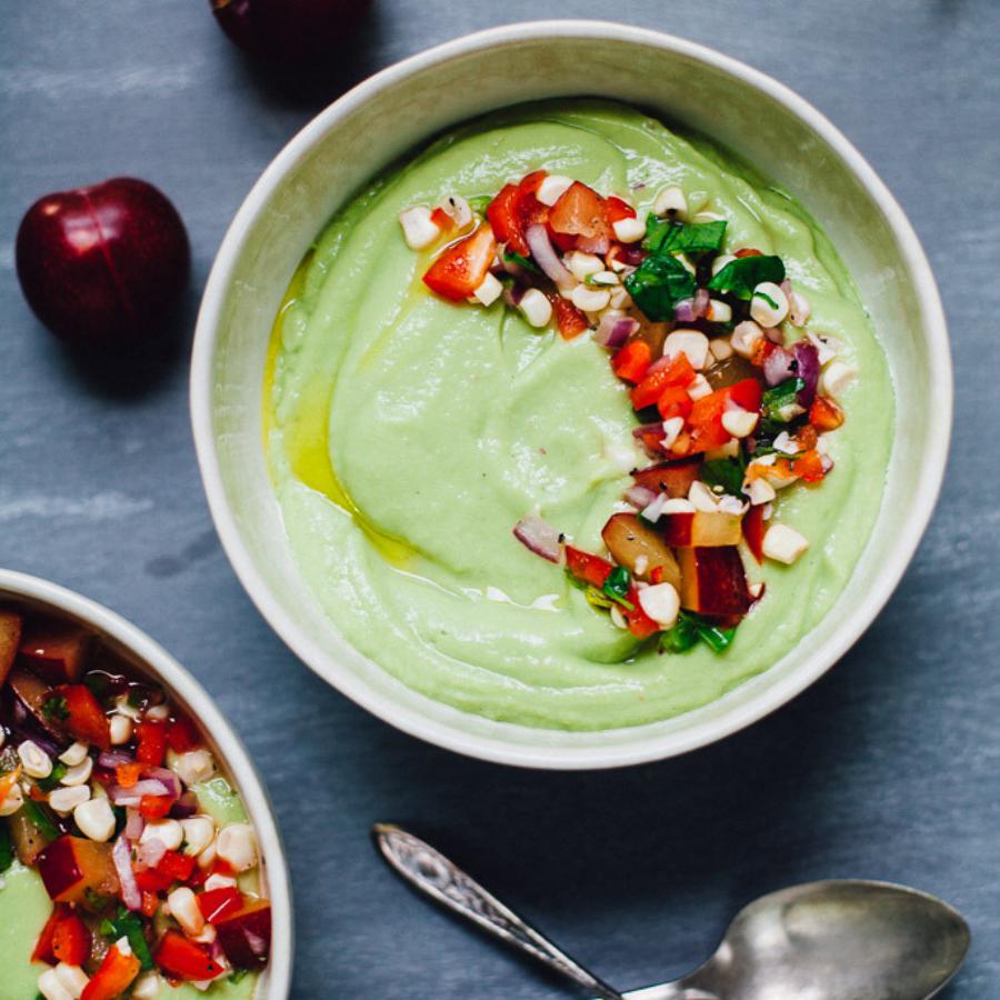 Dùng một chiếc chảo, cho trái bơ với mận, nước và các thành phần nguyên liệu khác vào, đun nhỏ lửa và nấu trên lửa vừa trong 10 phút. Chia hỗn hợp ra bát và để nguội trước khi ăn