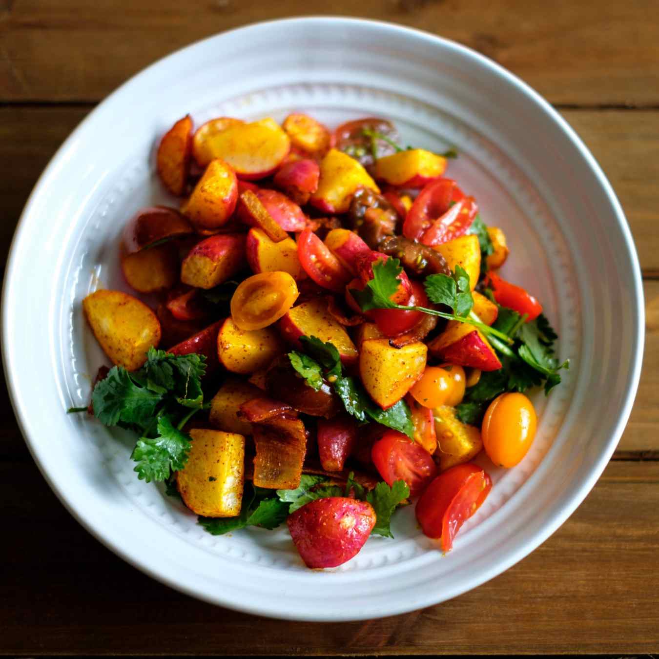 Dùng một khay nướng, cho cà chua với củ cải và các thành phần khác vào, trộn đều và nướng ở nhiệt độ 195°C (380°F) trong 20 phút