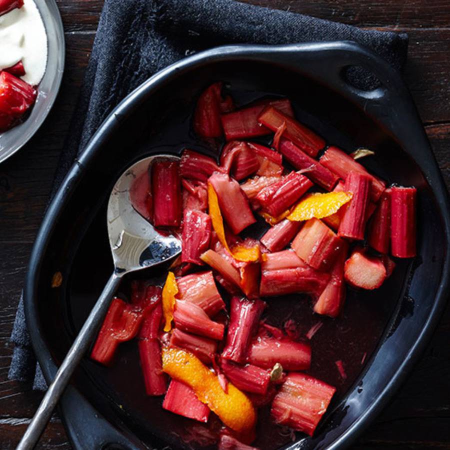 Xếp đại hoàng lên khay nướng có lót sẵn giấy nến, thêm đường Stevia, chiết xuất vani và các thành phần nguyên liệu khác, đảo đều và nướng ở nhiệt độ 175°C trong 20 phút. Chia đại hoàng ra bát và để nguội trước khi ăn