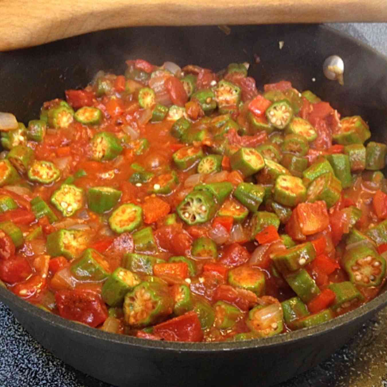 Cho cà chua, đậu bắp và các nguyên liệu khác vào, nấu trên lửa vừa trong 25 phút, chia ra đĩa và thưởng thức