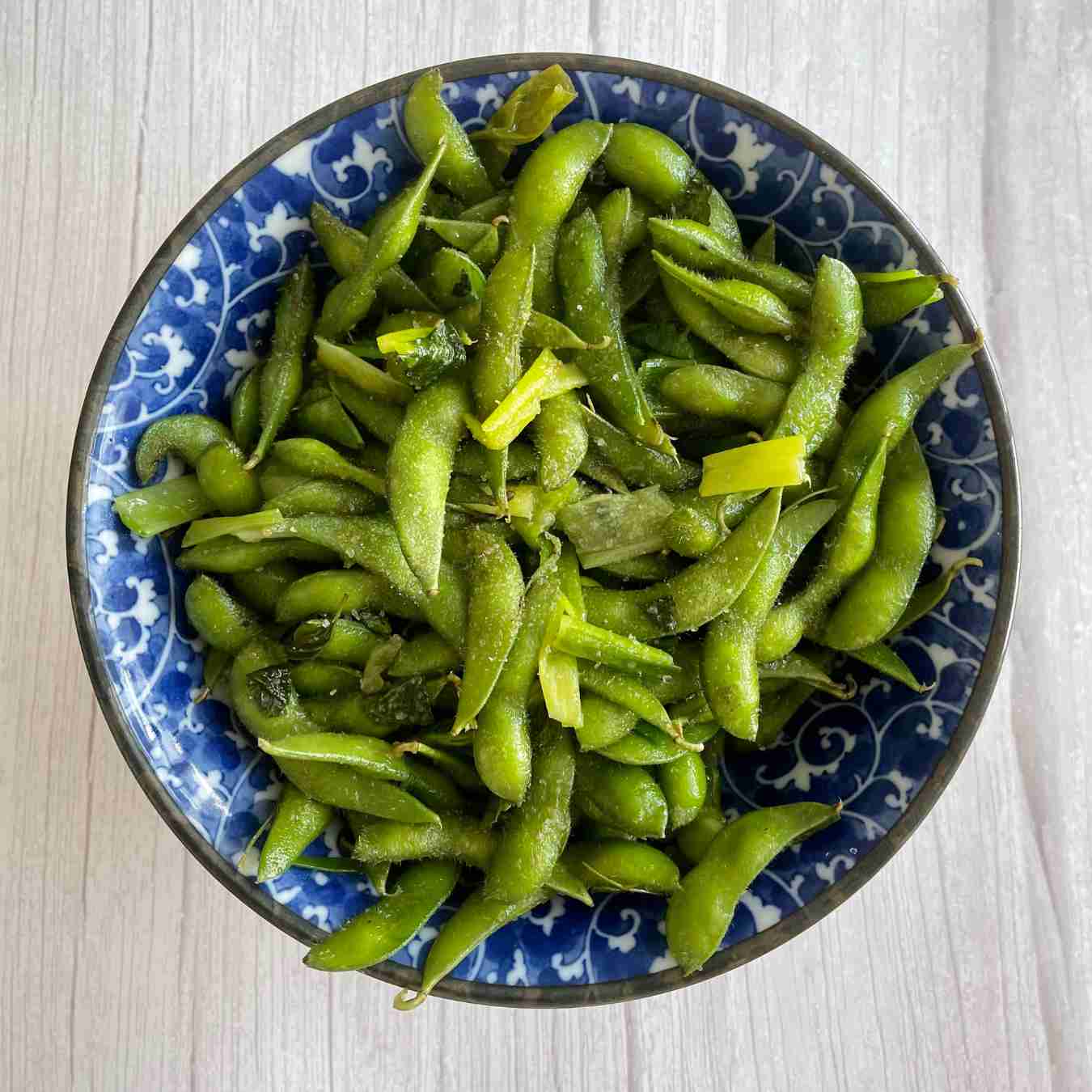 Làm nóng chảo với dầu ở lửa vừa cao. Thêm đậu nành luộc, muối, tiêu, hành lá, tỏi và bạc hà
