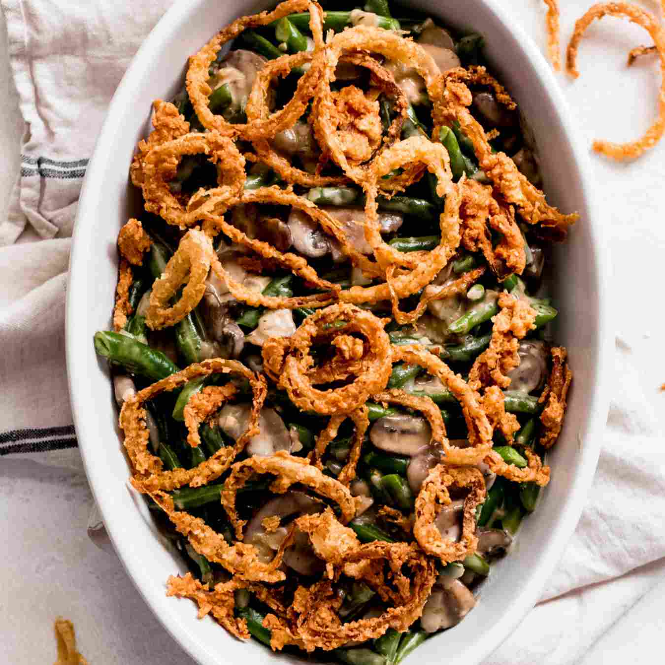 Chuyển hỗn hợp vào đĩa nướng, rắc một ít hỗn hợp hành giòn lên khắp, cho vào lò nướng ở 200ºC (400ºF) và nướng trong 15 phút. Thưởng thức nóng