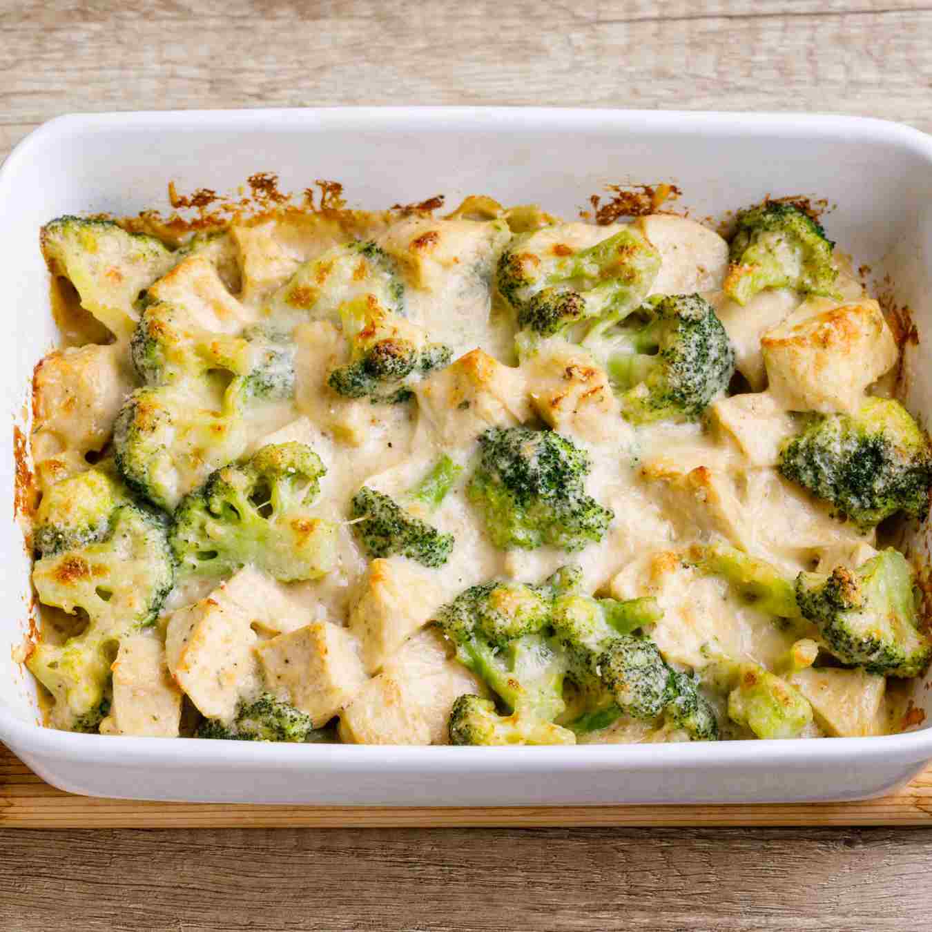 Trải bông cải xanh lên trên, sau đó cho ½ lượng phô mai vào. Dùng một cái bát, trộn Mayonnaise với nước cốt gà, muối, tiêu và chanh