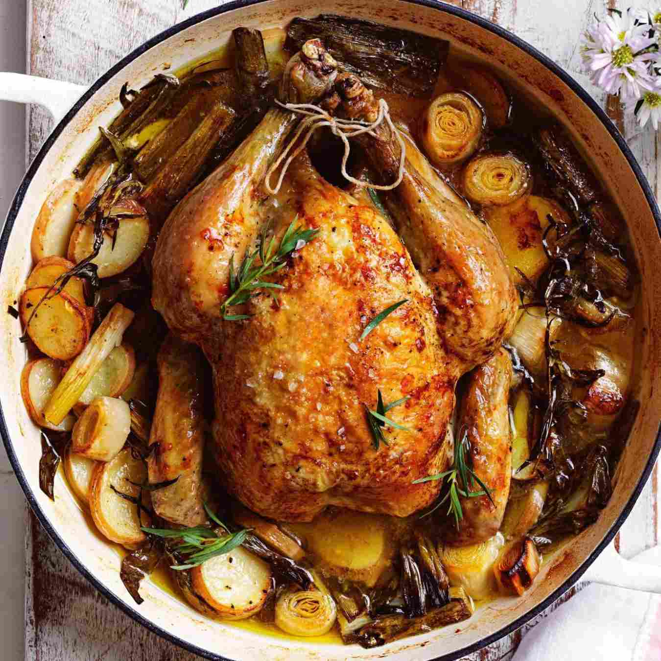 Sau khi nướng chín hoàn toàn, cắt thịt gà và chia rau ra đĩa để thưởng thức cùng với nước sốt thịt trong khay nướng