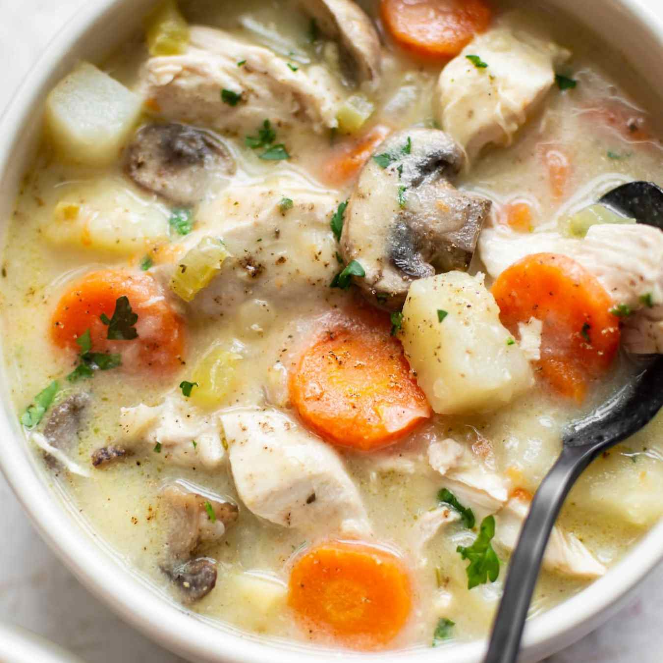 Thêm kem, cỏ xạ hương, muối và tiêu cho vừa ăn, đảo đều, bỏ lá nguyệt quế, chia nước hầm ra các bát và dọn ra đĩa