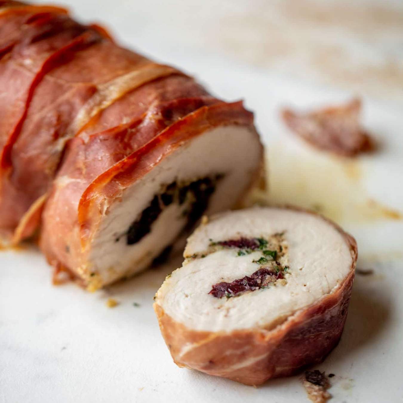 Cuộn chặt các lát gà tây này lại rồi buộc cố định bằng lá hẹ và đặt sang một bên