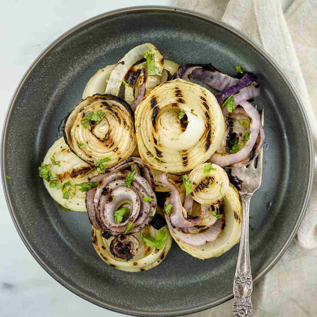 Lấy hành tây ra khỏi giấy bạc, cắt thành từng khoanh lớn rồi bày ra đĩa