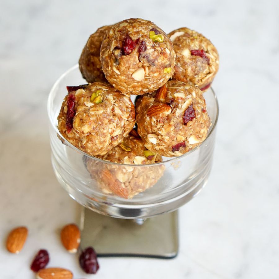 Dùng một cái bát, trộn hạt lanh với các loại hạt còn lại, kem dừa và các thành phần khác ngoại (trừ dầu ăn dạng xịt), trộn đều và nặn hình 12 quả bóng cỡ vừa từ hỗn hợp này