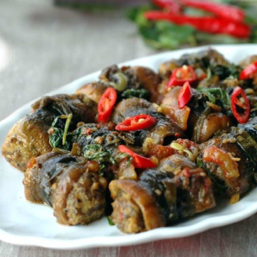 Đặt miếng gan, miếng mỡ phần, miếng củ đậu vào lươn, rồi cuộn lại. Lấy lá hành chần buộc lại