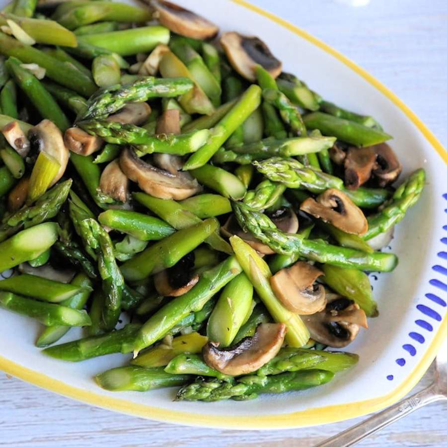 Làm nóng chảo với dầu ăn ở lửa trung bình cao, cho nấm, măng tây và các thành phần nguyên liệu khác vào, đảo đều, nấu trong 15 phút, chia ra các đĩa và thưởng thức