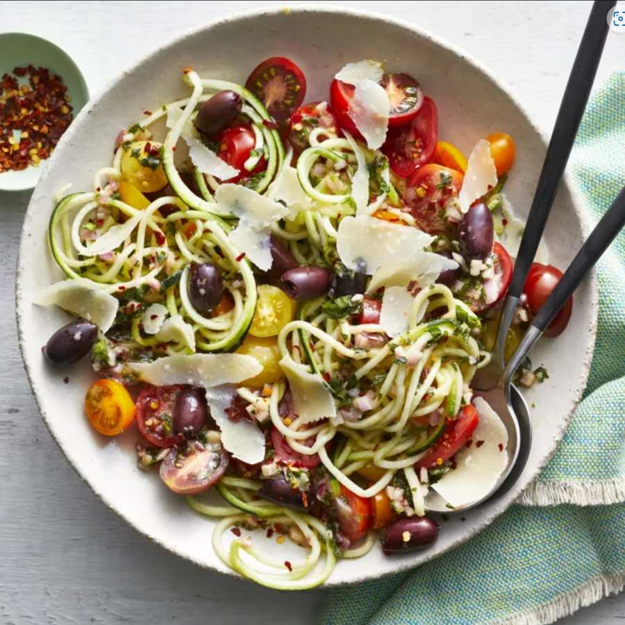 Dùng một cái bát, trộn mì bí ngòi với ớt chuông, cà chua và các thành phần nguyên liệu khác, trộn đều và thưởng thức