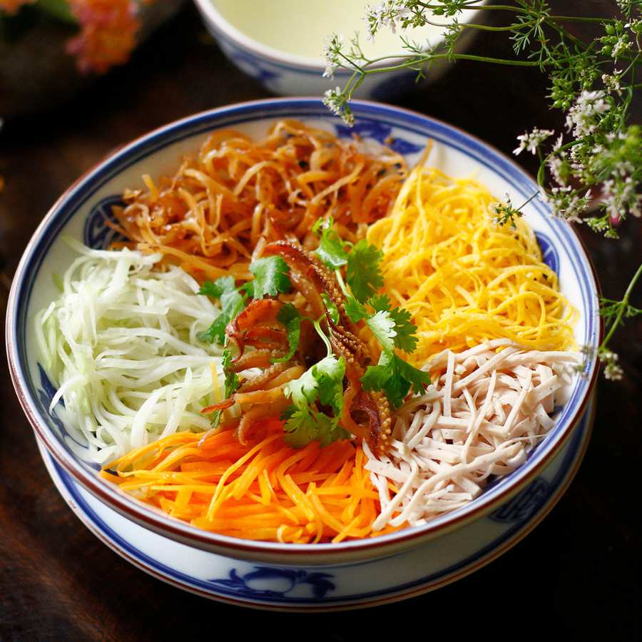 Thịt heo luộc, thái chỉ. Thịt gà luộc, thái chỉ. Trứng tráng mỏng, thái chỉ. Đậu Hà Lan tước bỏ xơ, rửa sạch, thái sợi. Giò lụa thái chỉ. Su hào gọt vỏ, thái chỉ. Nấm hương ngâm, rửa thái chỉ