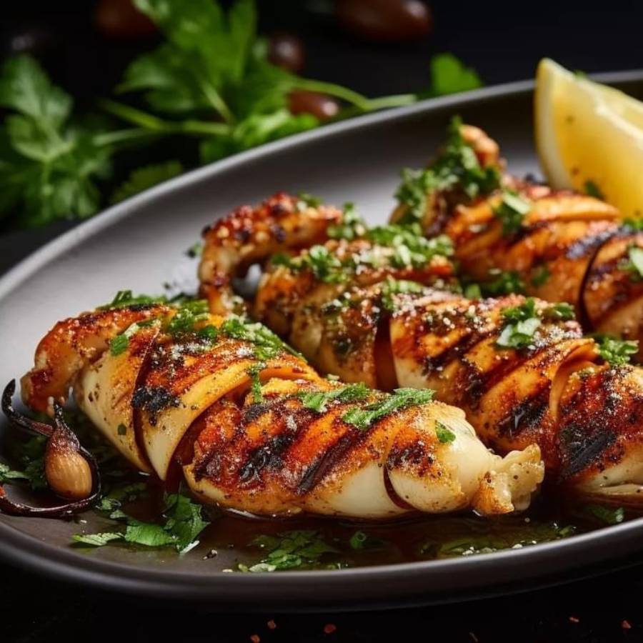 Dội sốt cà chua lên mực, ăn nóng, xung quanh bày xà lách, rau mùi