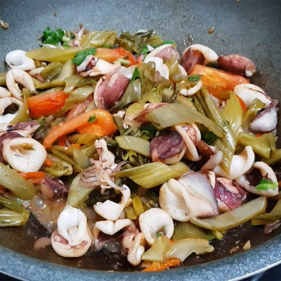 Tiếp tục đun mỡ nóng già, cho cà chua, dưa chua vào xào kỹ, nêm vừa mắm, đường, mì chính, cho mực và hành tươi cắt khúc vào đảo đều. Xúc ra đĩa, ăn nóng kèm rau mùi