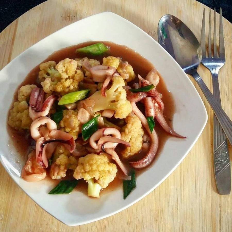 Món ăn có màu sắc tự nhiên của nguyên liệu, thơm dậy mùi cần tây, hành, tỏi. Vị ngon, ngọt đậm của mực và hoa lơ. Mực giòn, rau củ chín tới không nhũn nát, rau bóng mượt, đĩa xào không chảy nước. Chúc bạn ngon miệng