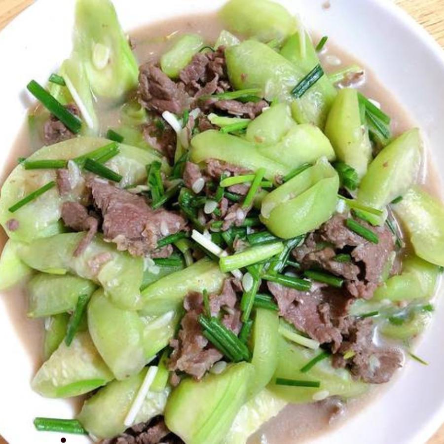 Phi thơm hành tỏi, cho thịt bò vào xào, xúc ra đĩa. Tiếp tục phi thơm hành tỏi, cho mướp vào xào nêm mắm muối, cho thịt vào rồi nêm mì chính