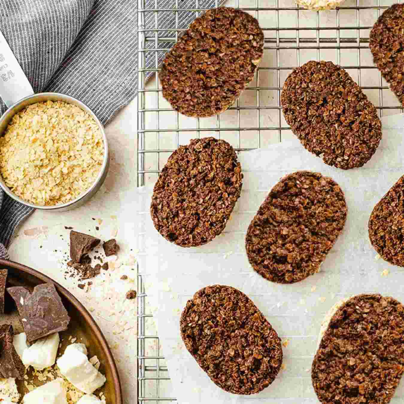 Thêm hạt Nibs cacao và khuấy cho đến khi thành bột. Chia bột thành 2 phần, nặn thành hình trụ, đặt lên khay nướng đã lót sẵn giấy bạc, cán phẳng, đậy bằng giấy nến rồi cho vào lò nướng ở nhiệt độ 140ºC (285ºF) và nướng trong 20 phút