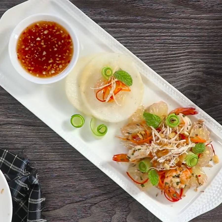Tỏi ớt giã nhỏ, trộn cùng với nước mắm, đường ăn kiêng, mì chính, cho mực, tép bưởi vào hỗn hợp đã hoà ở trên, trộn đều, cuối cùng cho rau mùi
