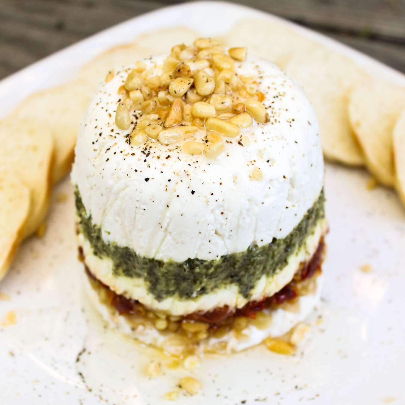 Thêm một lớp phô mai khác, sau đó thêm cà chua khô và ¼ cup hạt thông