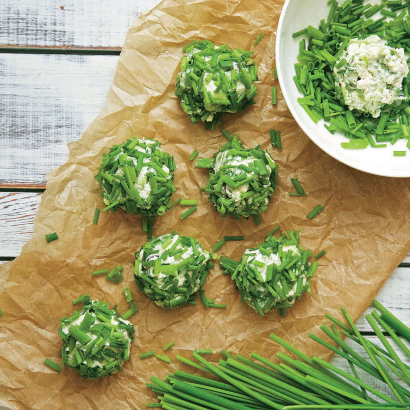 Nặn thành 6 viên từ hỗn hợp. Lăn từng viên qua lá hẹ tây đã cắt nhỏ và thưởng thức